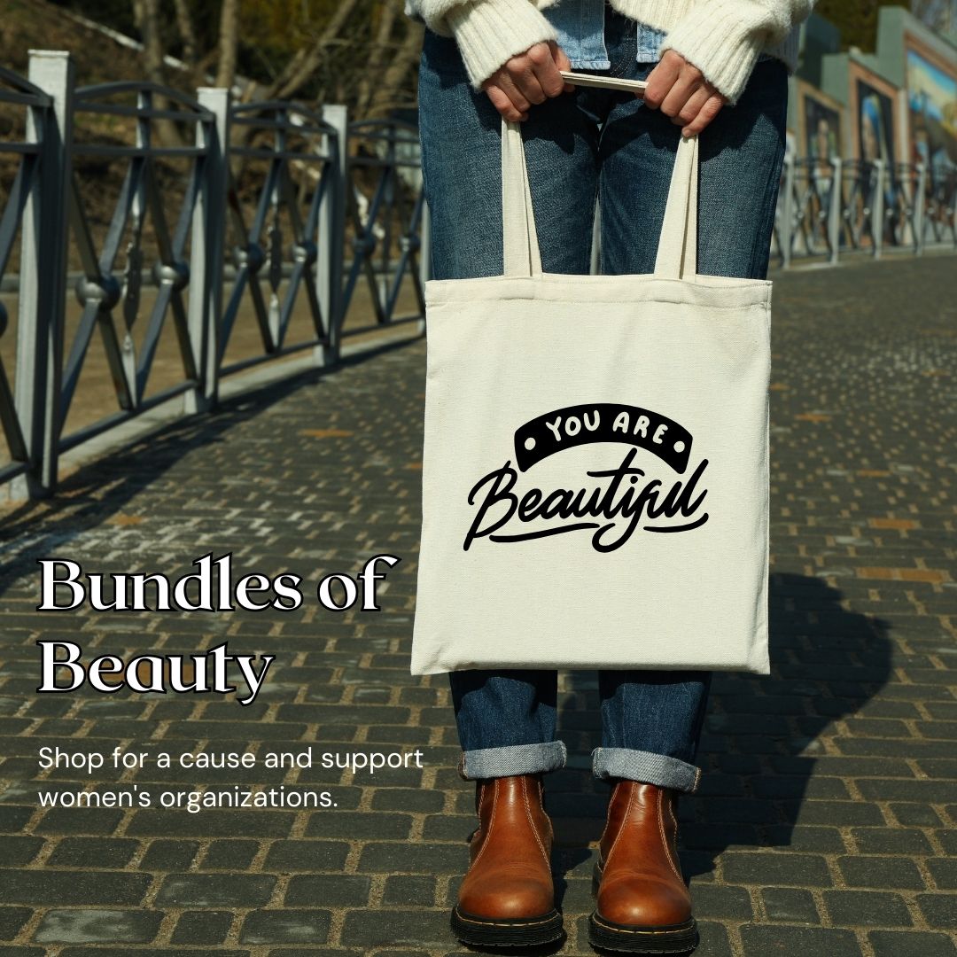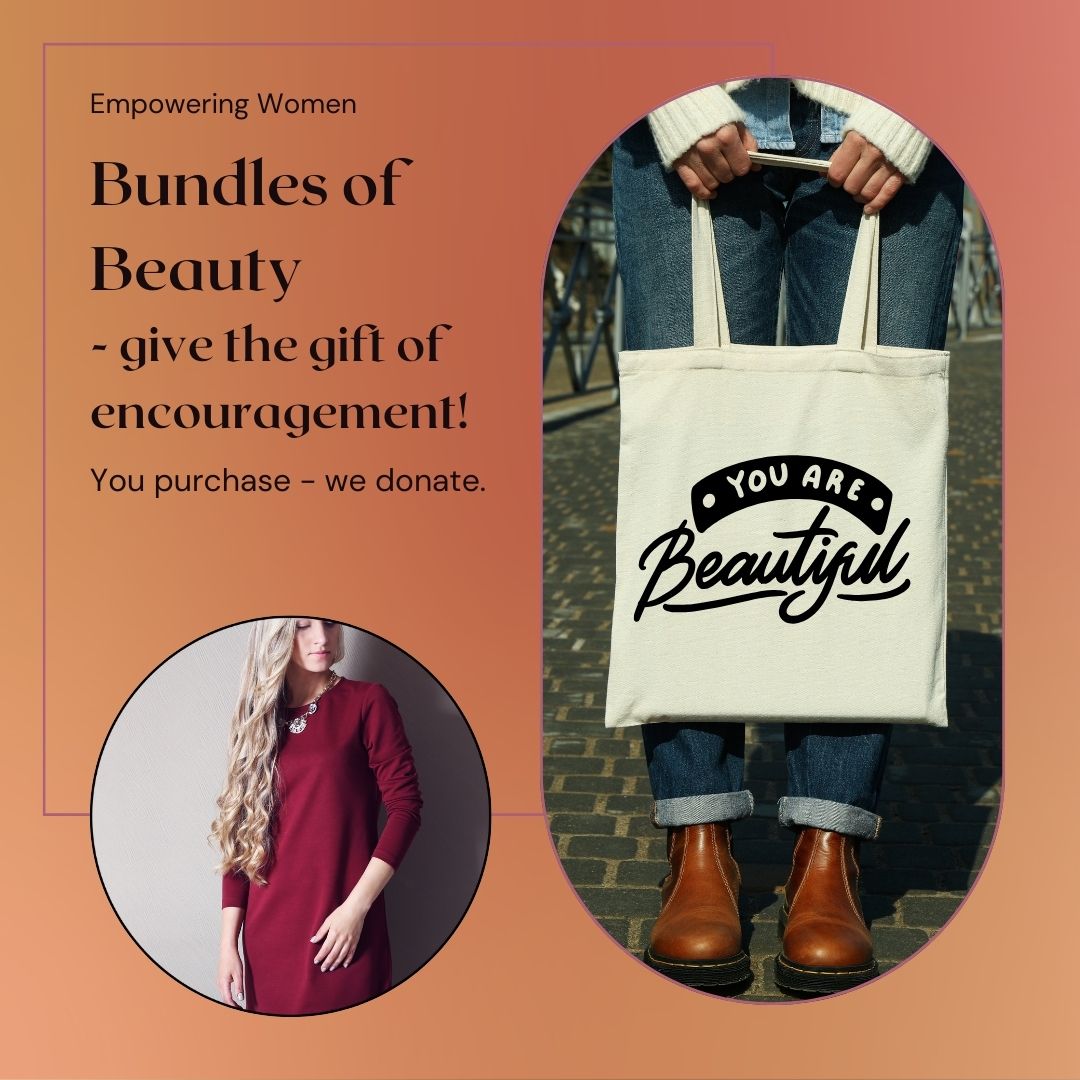 When you purchase a Bundle of Beauty, a woman in need receives a tote bag containing a new dress with tags, new blouse, a toiletry item, warm socks, and a note of encouragement.