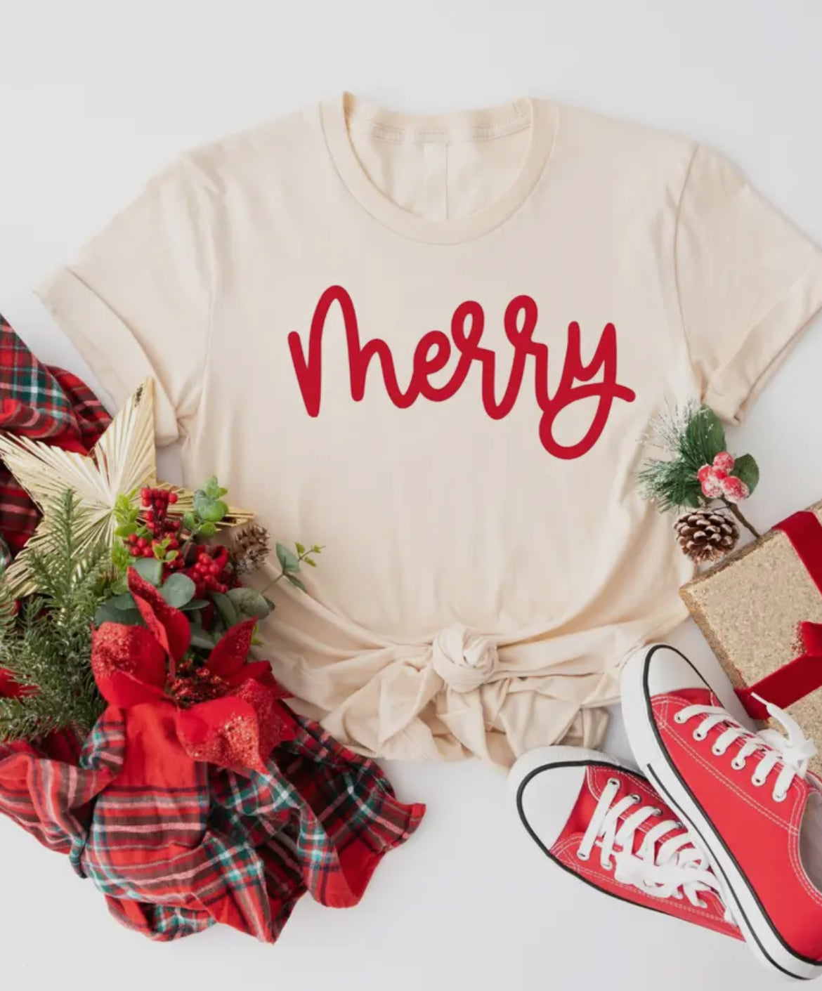 THIS STYLE IS A CREAM TEE (not gray as pictured. See next photo for example of red print on cream tee). Says “Jesus is the Reason for the Season” in red print. ❤️