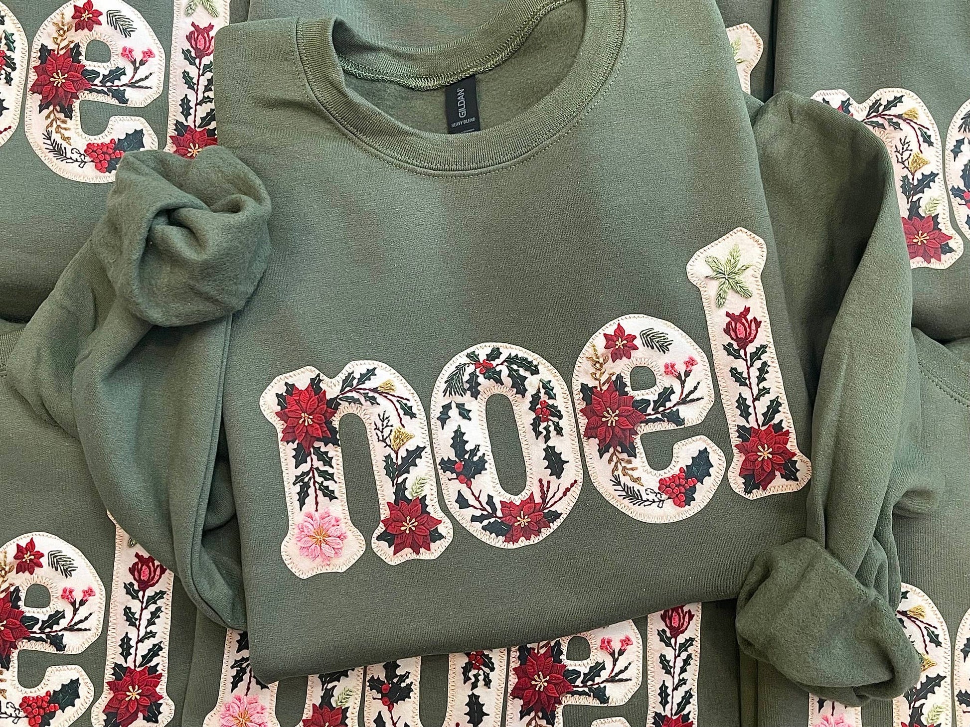 Features: soft, floral-inspired NOEL letters with a handmade look — the perfect blend of cozy and classic. Made from premium, soft fleece-lined; Army green sweatshirt