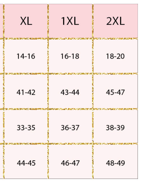 Size info: See last photo for measurements. XL 12-14, 1XL 16-18, 2XL 20-22