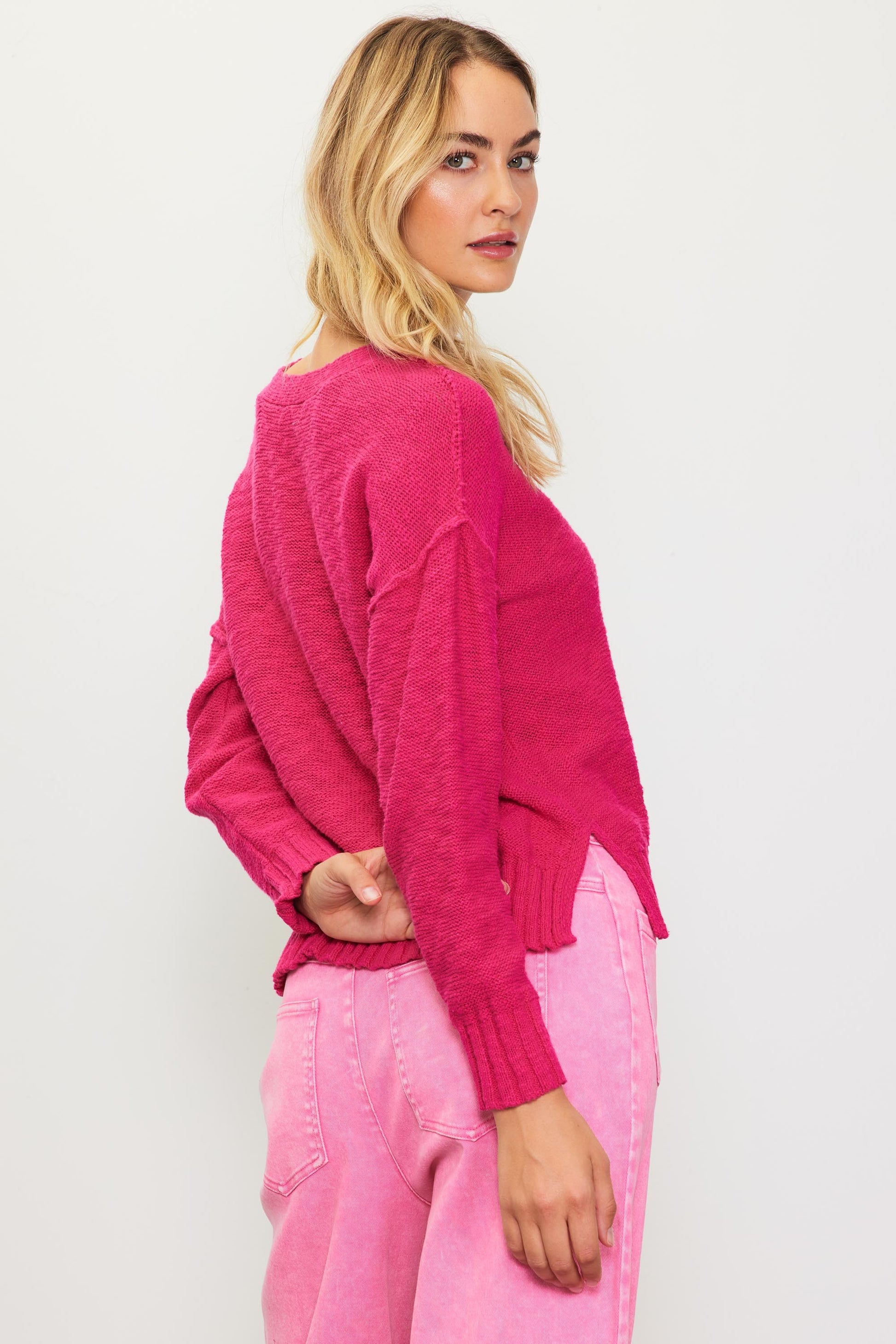 Stylish drop-sleeve sweater in peony pink! Features: mid-length, vented sides, and v-neck.